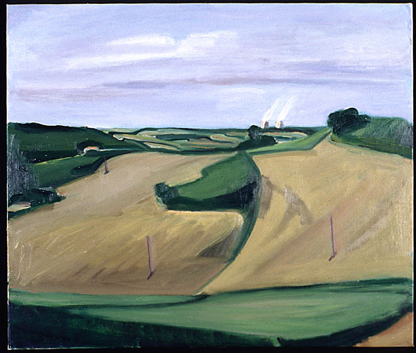 Hearne Pardee is one of these artists. His recent show at the Bowery Gallery (November 3-22, 2000), demonstrates his discipline, commitment, and search for personal style. This exhibit can be seen as the documentation of a working process that has expression in collages, drawings and painting. Most outstanding was a painting entitled "MASONVILLE" in which a yellow field is tilted backward on a green plane. Beyond the field is a distant landscape of a rural horizon broken by two towers. Although modest in size this picture has a large feeling. The deep space achieved here is the result of careful structuring. The painting arrives at a conclusion that is solid. A small green area in the center of the picture is held in space and achieves that sought after condition of dual authority: both going back into the distance and sitting squarely on the frontal plane. The resulting feeling is emblematic and powerful. Also in the show there were a number of pencil studies from nature, scenes of rural life, wooded hills with buildings, seen through a maze of trees. He seems to like spatial complexity and is very good with finding it in his direct studies. He then sometimes takes these studies and gives them a twist into abstraction, adding areas of color (rectangles of color paper) that further take up the dialogue of spatial movement in and out. Pardee is clearly at his best in his paintings where academics and rules of spatial analysis disappear into the struggle of making a finished image.